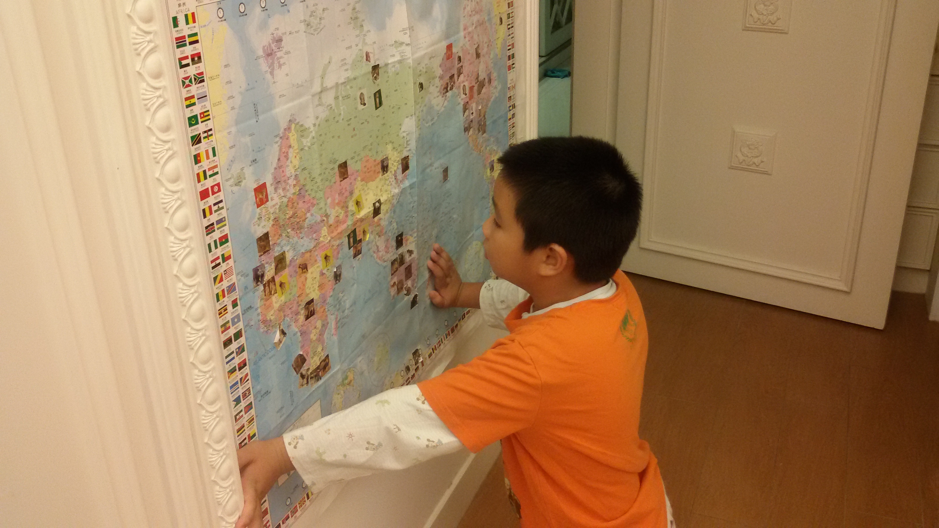 我們也用世界地圖, 讓孩子們去辨識在地圖上看到的地形…..把所學的跟真正的地圖做個結合。