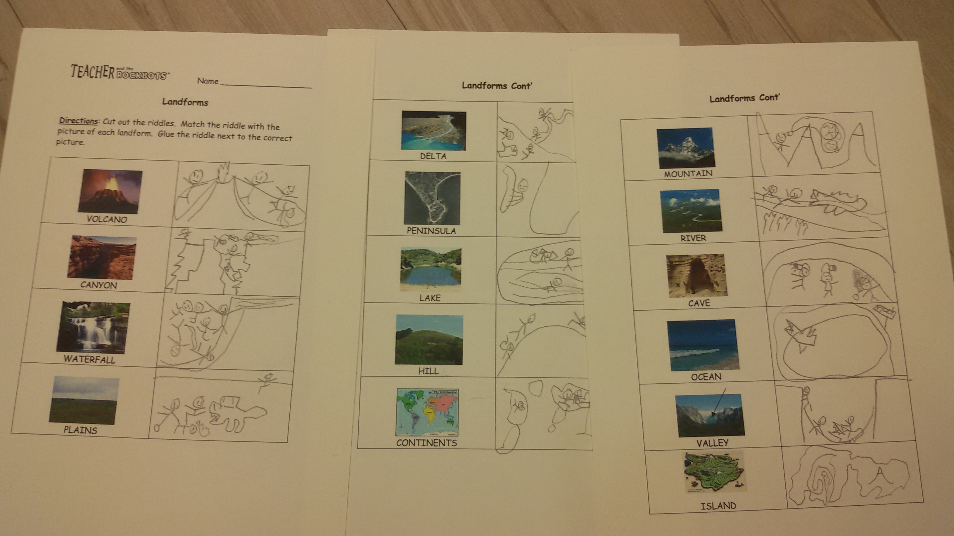 幼稚園階段的小孩也有地形的學習單, 可以用剪貼的方式match 地形的種類, 也可以很開心的學習唷!