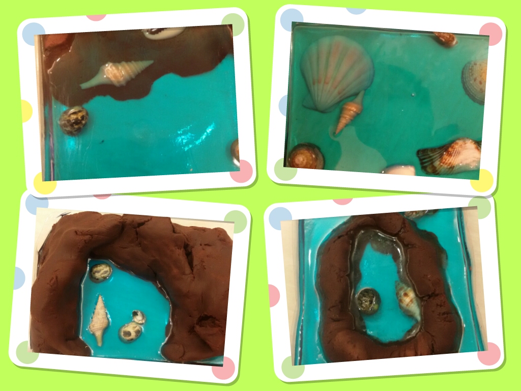 待乾了之後再用混合好的環氧樹脂(記得要加兩滴藍色色素唷…才像海或河水的顏色)倒入盒子內其他地方…但不要倒太滿