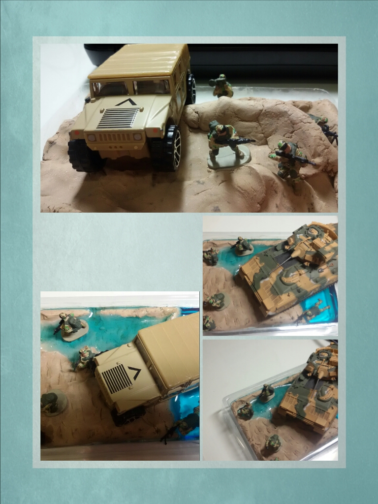 對了, 做好的地形模型除了學地理以外, 也可以立即變成男孩子最喜歡玩的玩具!!! 我老公馬上靈機一動把他收藏的坦克車跟小小兵擺出來, 這些模型就變成他們三個男生的玩具了…呵呵
