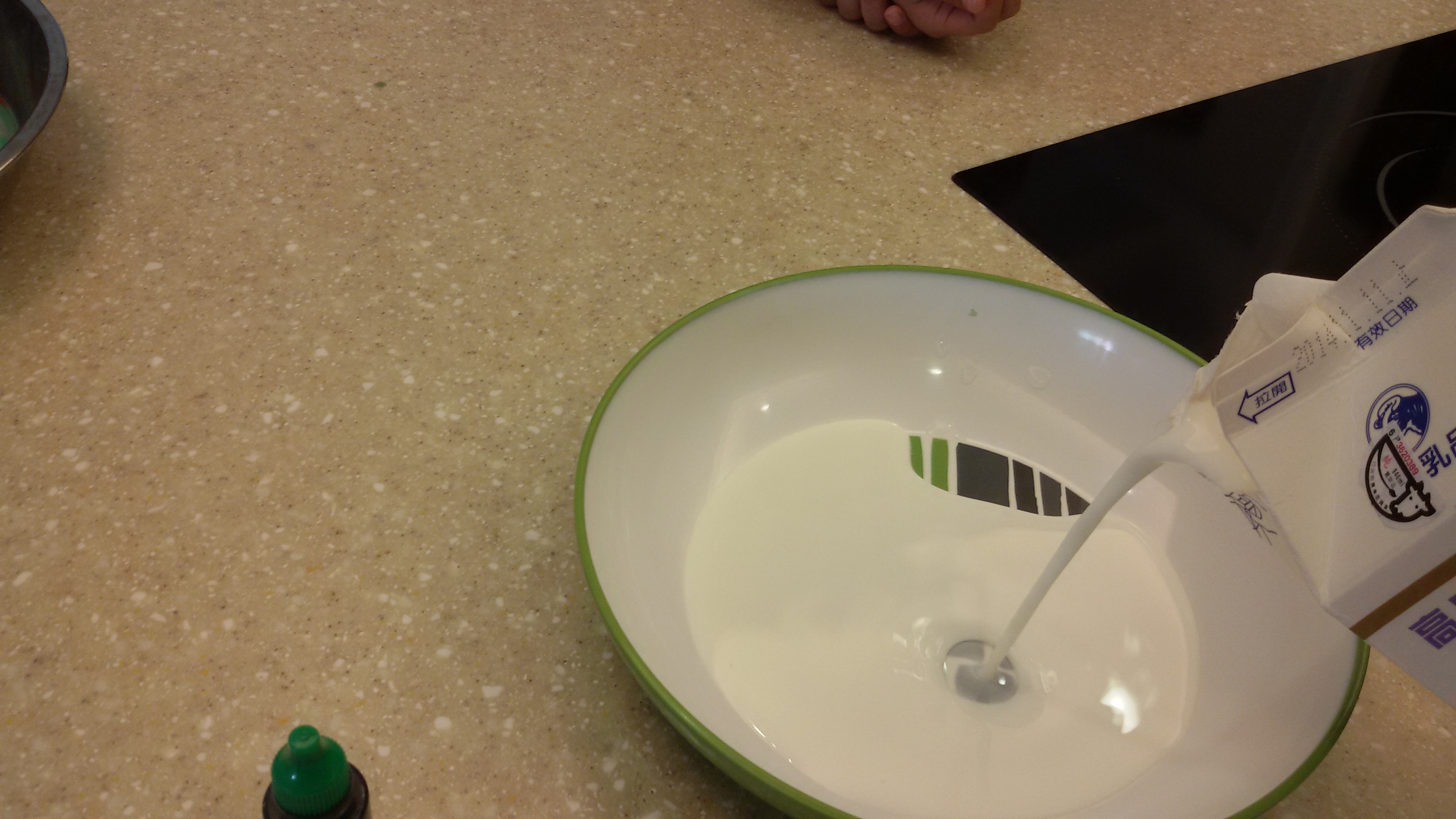 2. 滴幾滴不同顏色的色素到牛奶裡
