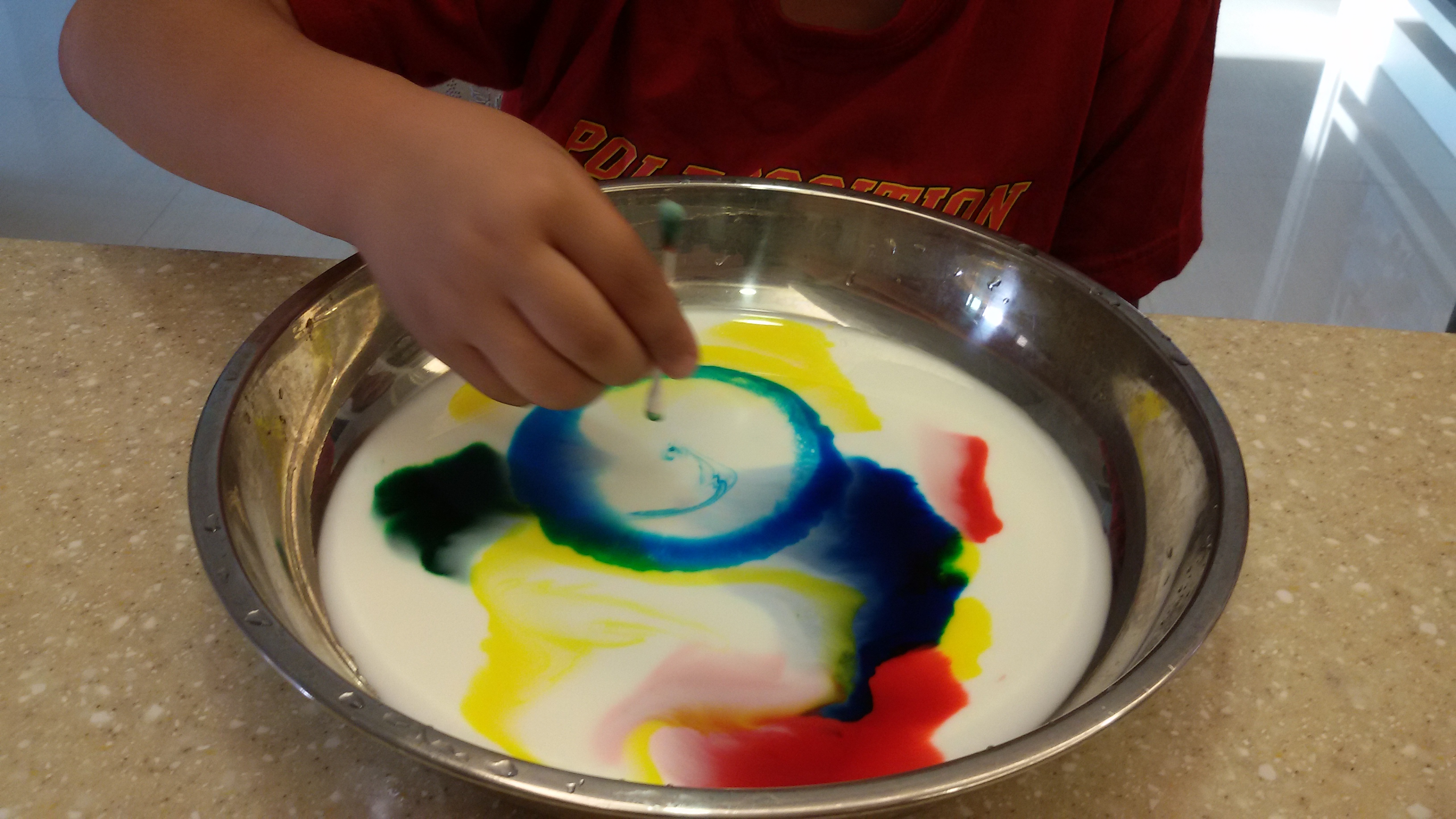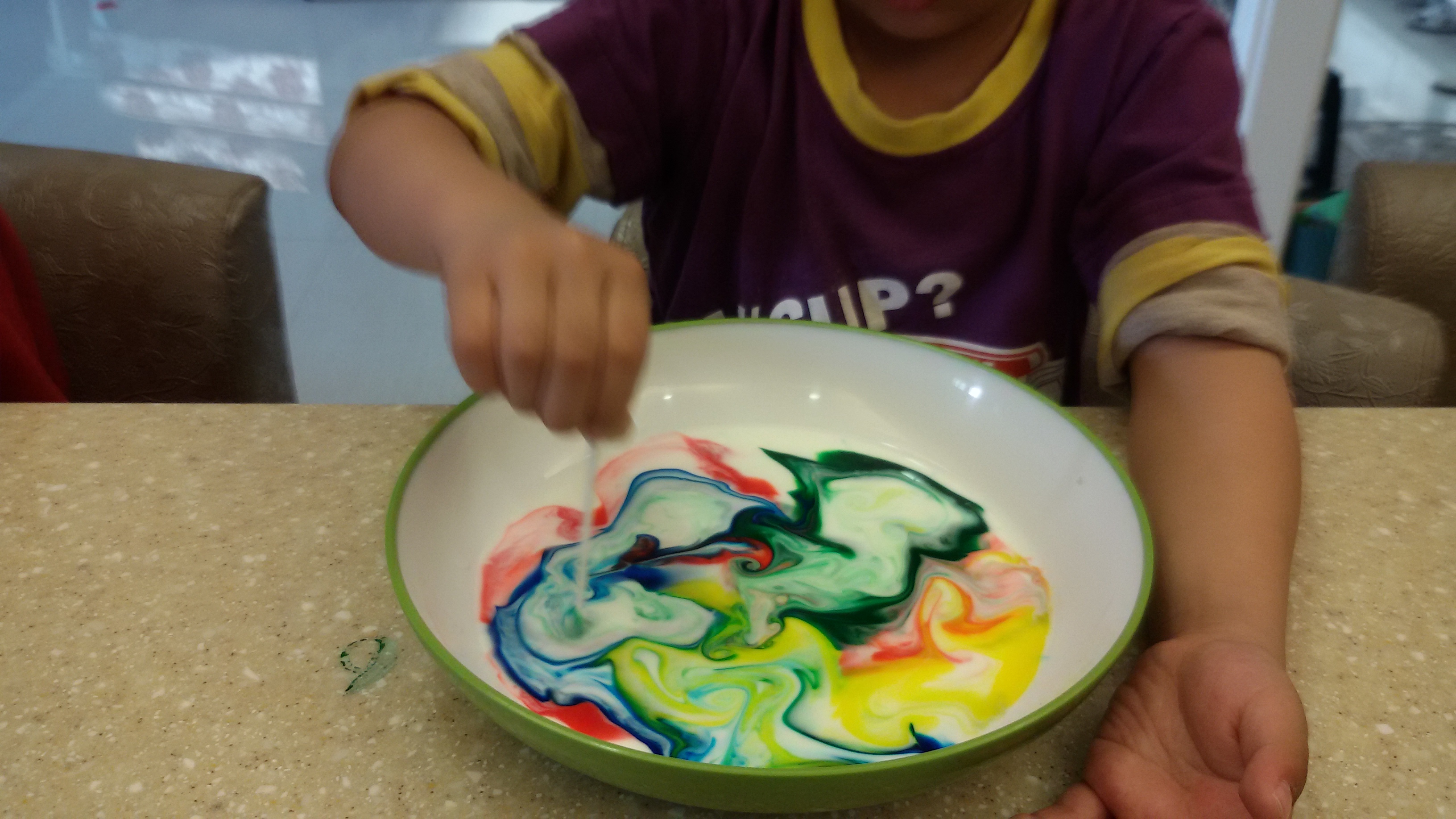 這個實驗最主要是要教孩子分子的概念。牛奶本身就有很多不同的分子, 有脂肪, 蛋白質, 糖分, 跟礦物質。當沾著洗碗精的棉花棒進入牛奶裡時, 洗碗精的化學成分便會跟牛奶中的分子產生變化, 讓這些分子匯聚一起…也就是為什麼用洗碗精可以將油膩的碗洗乾淨的原理。所以當棉花棒一碰到顏色, 這些顏色就會開始跑囉! (不是因為顏色跟牛奶產生變化, 是因為牛奶中的分子跟洗碗精產生變化) 很簡單吧?