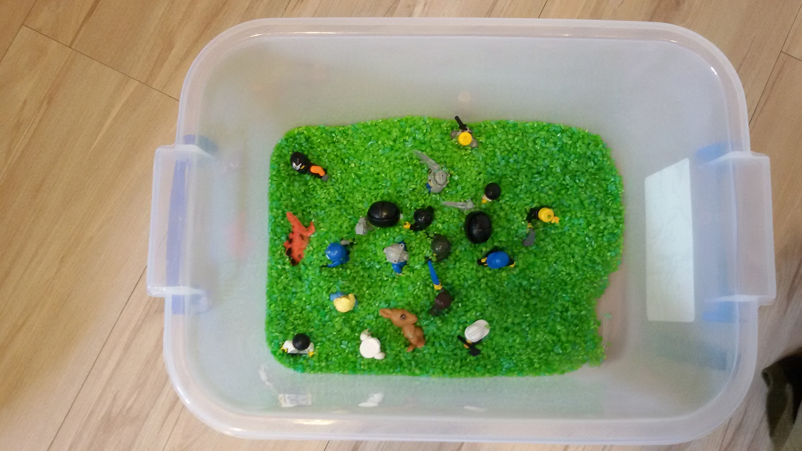 我們也玩過泥土, 水…鹽…米..等等的感官箱配合不同的主題。感官箱不但可以刺激孩子的想像力, 也可以藉著角色扮演發展口語的表達, 以及與同伴的互動…了解角色的工作內容! 好玩又有意義! 如果家裡沒有石頭等這些材料, 其實幾杯米或者只是碎回收紙也可以拿來玩喔!