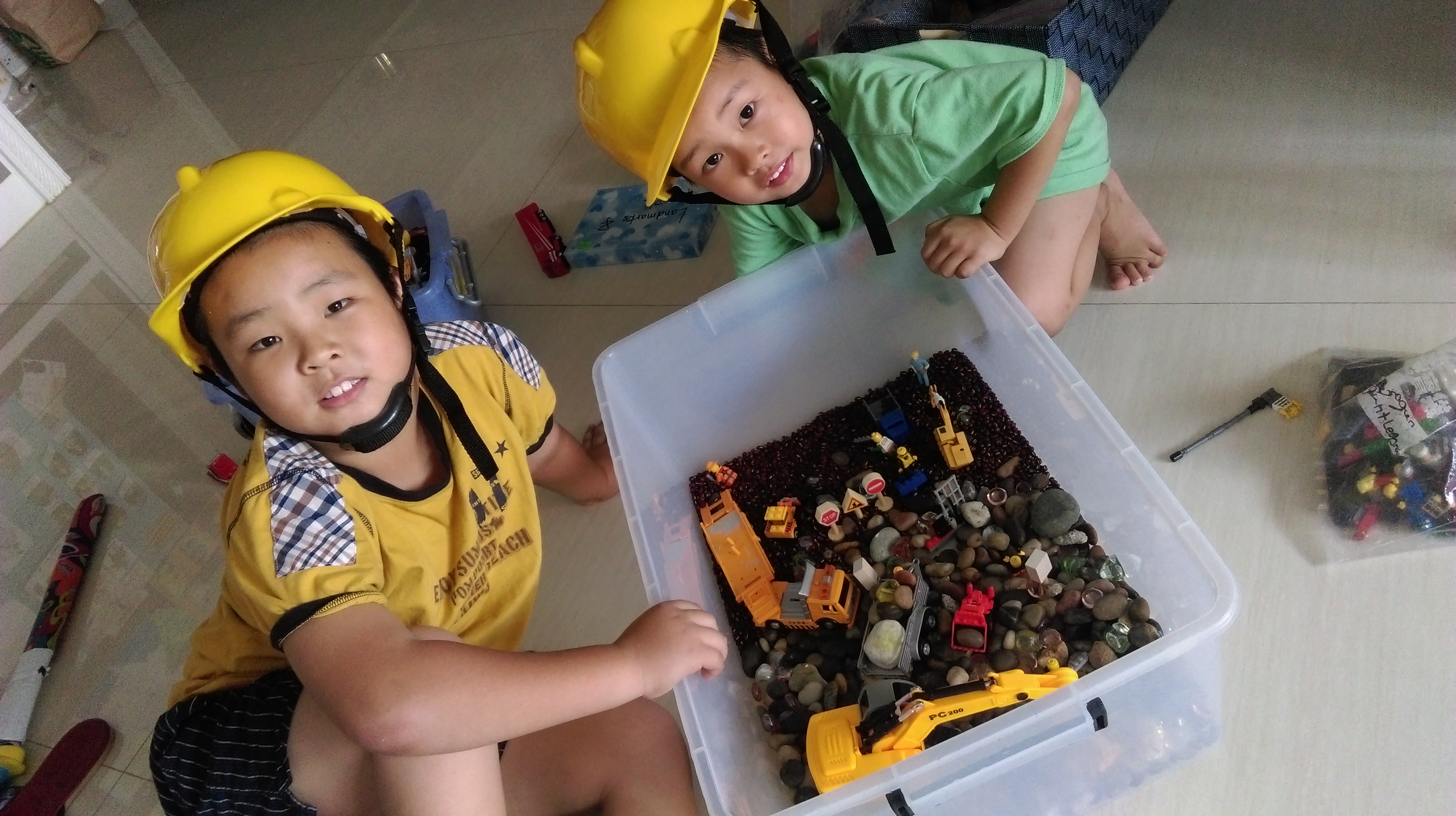 我們先用石頭鋪薄薄的一層, 另外空的地方再鋪紅豆…..把車車擺進去, 放幾個樂高人! 耶! 搞定!!! 媽媽我要去睡午覺了………….. 就這樣, 他們兄弟倆玩了一下午!