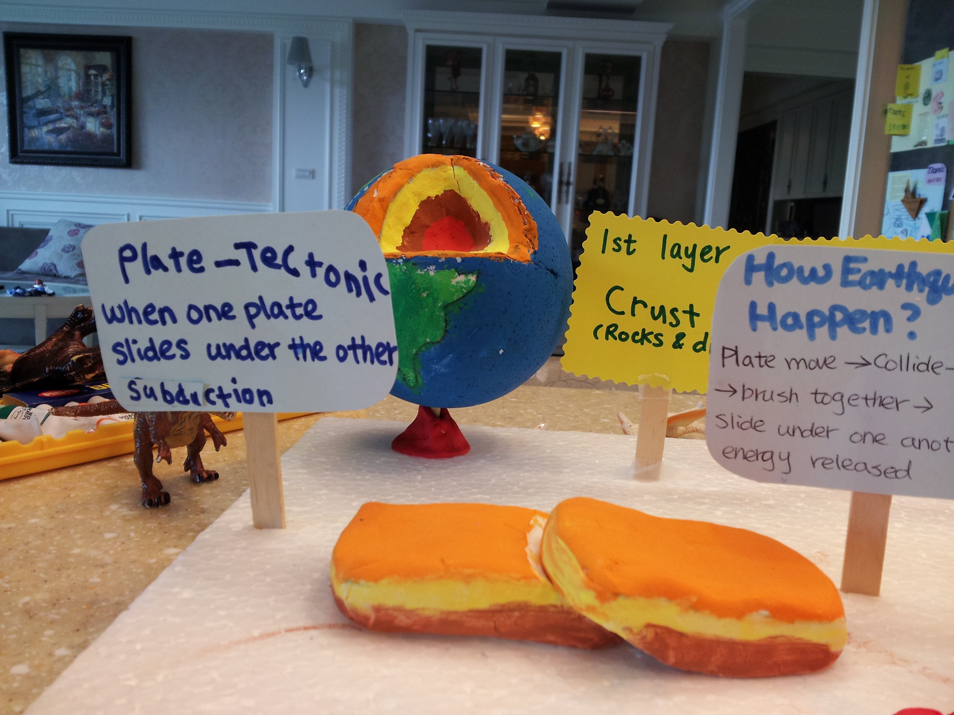 我們用保麗龍球外面包一層薄薄的紙黏土 (因為保麗龍球不好上色), 來做一個地球的模型, 將球的1/4 挖空, 把這四層畫出來。最後立在後的珍珠板上, 再將每一層的定義寫出來…耶! 完成了!