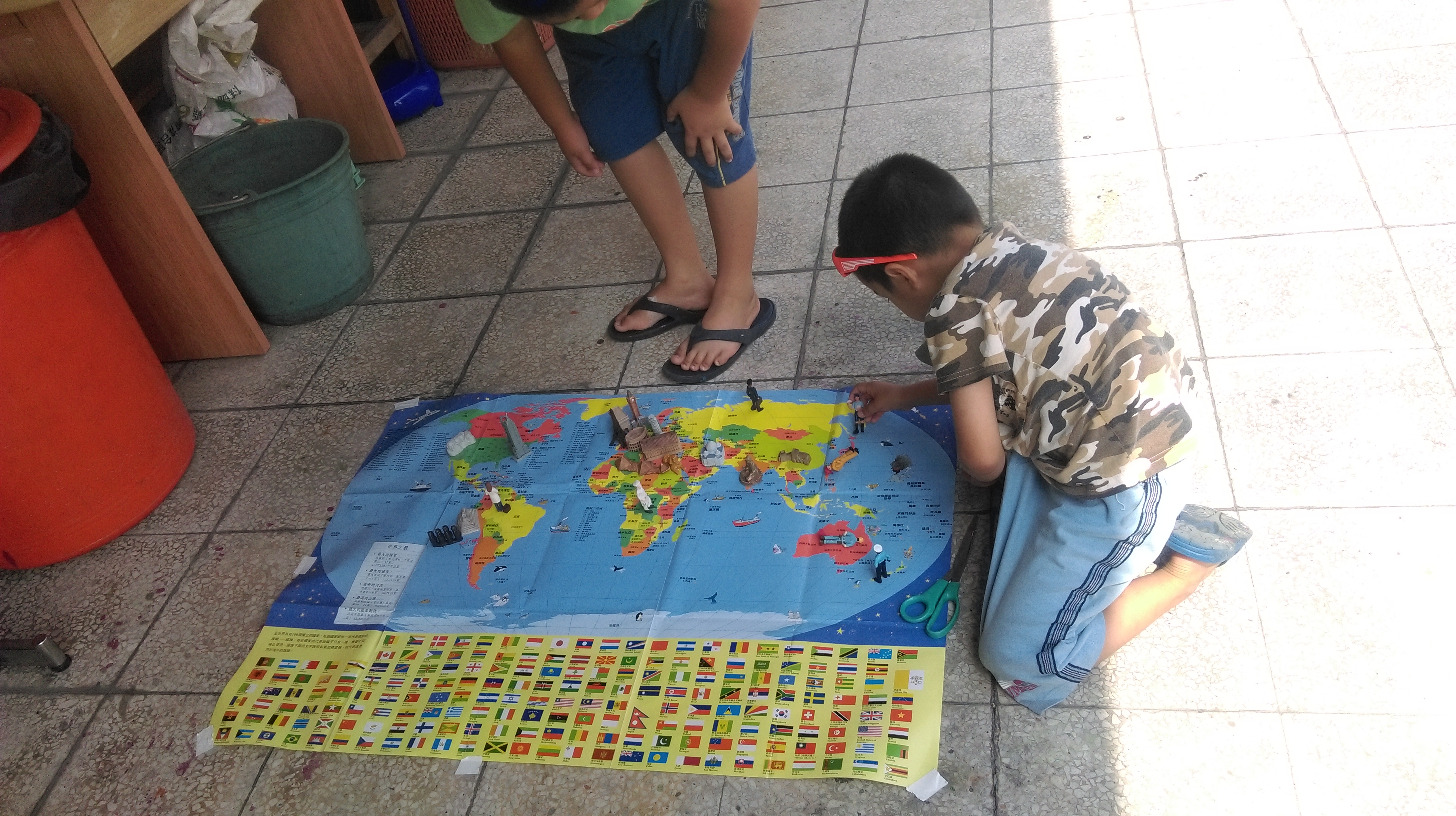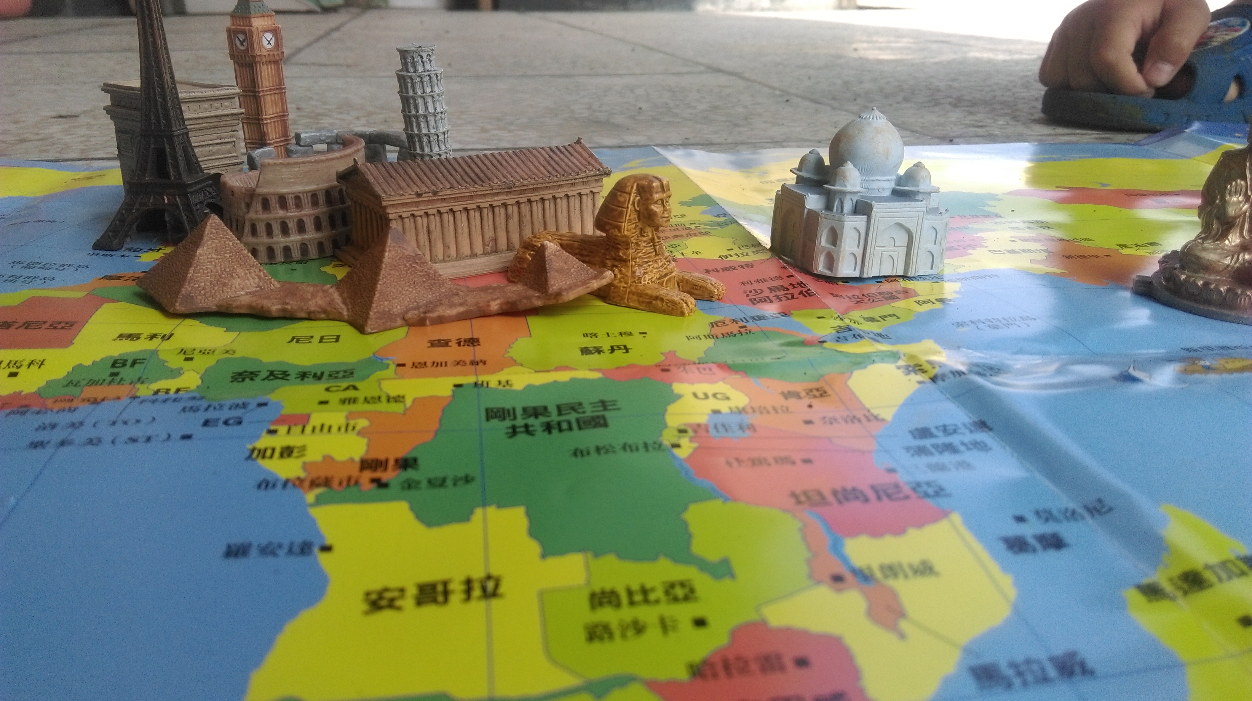 把地圖固定好在地板上之後, 我用一些迷你地標模型來做練習。金字塔在埃及, 自由女神像在紐約, 萬里長城在中國…就這樣擺出來後, 讓孩子透過這些地標來練習看經緯度。