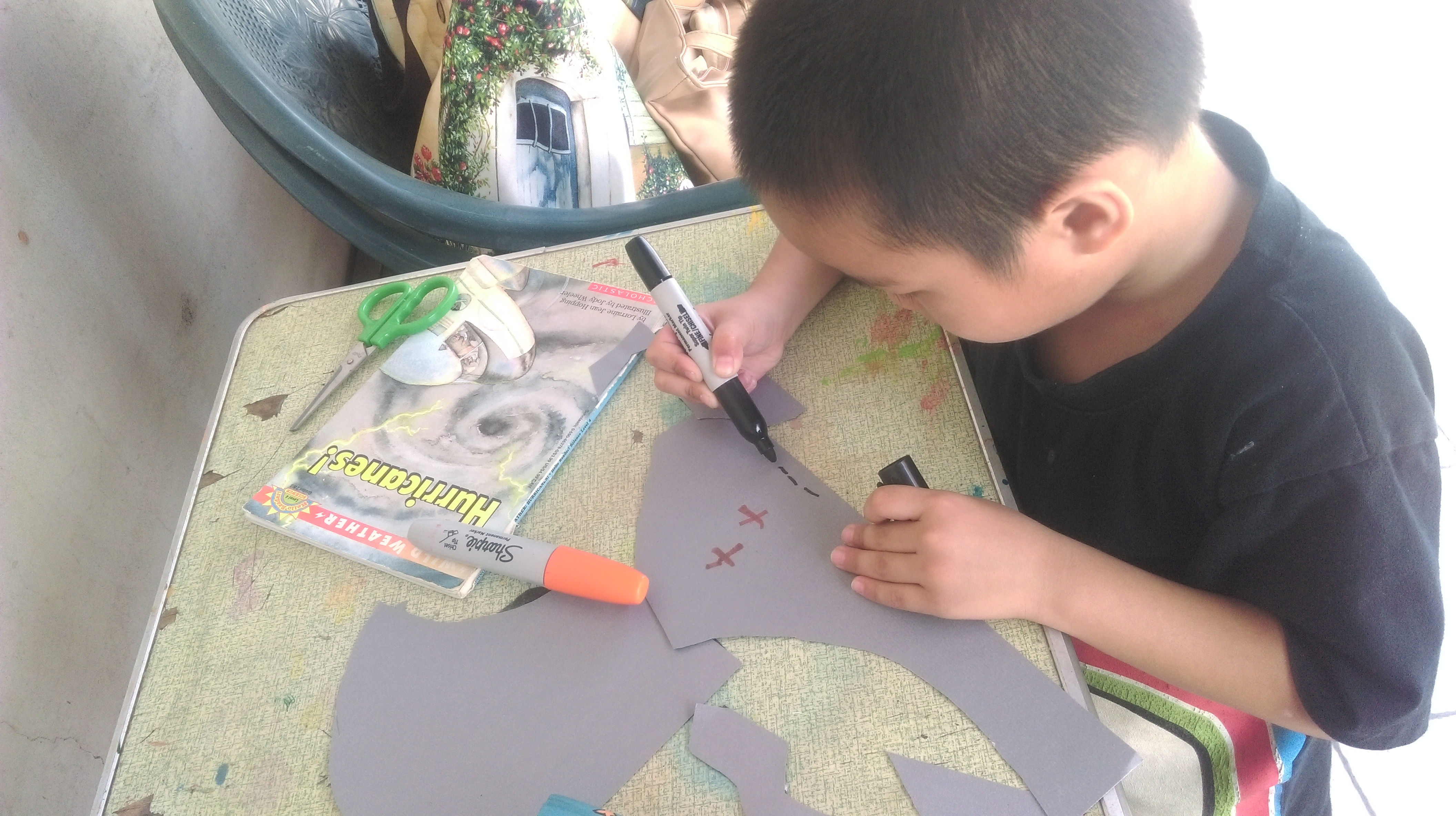 在解釋的過程, 孩子用加號跟減號分別代表正極跟負極。記得唷, 正極都會在雲的上端, 負的才在下方唷。