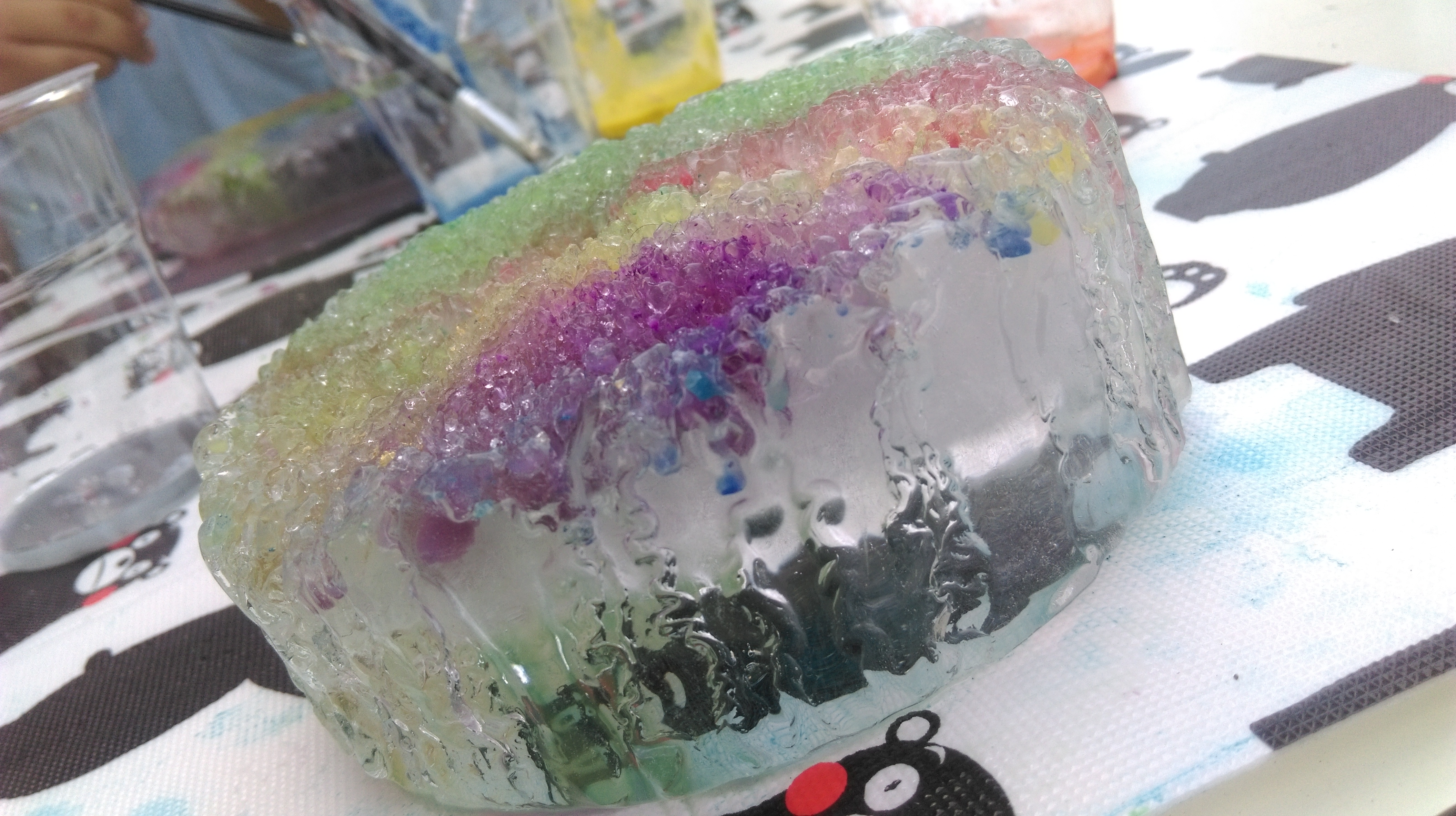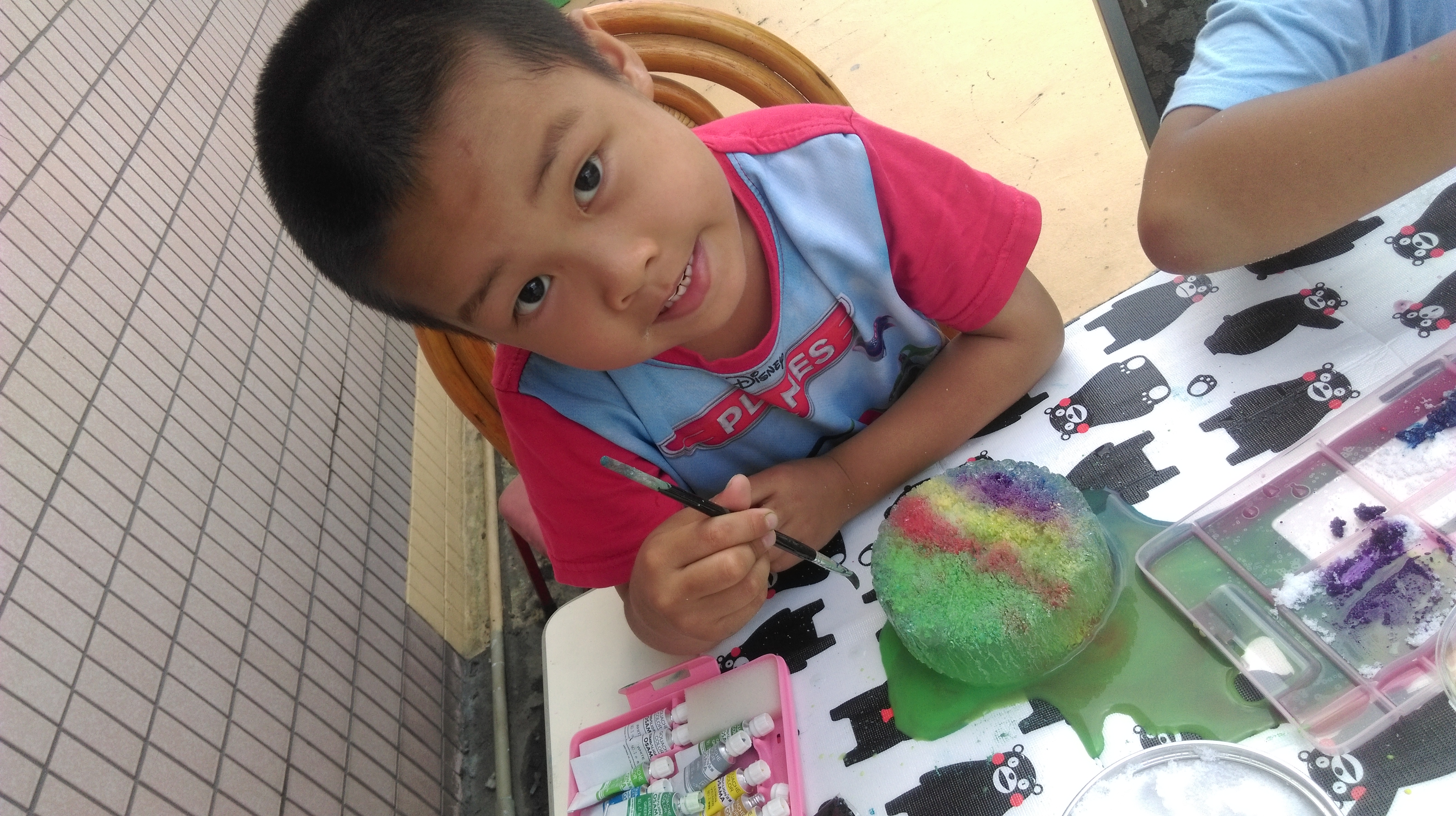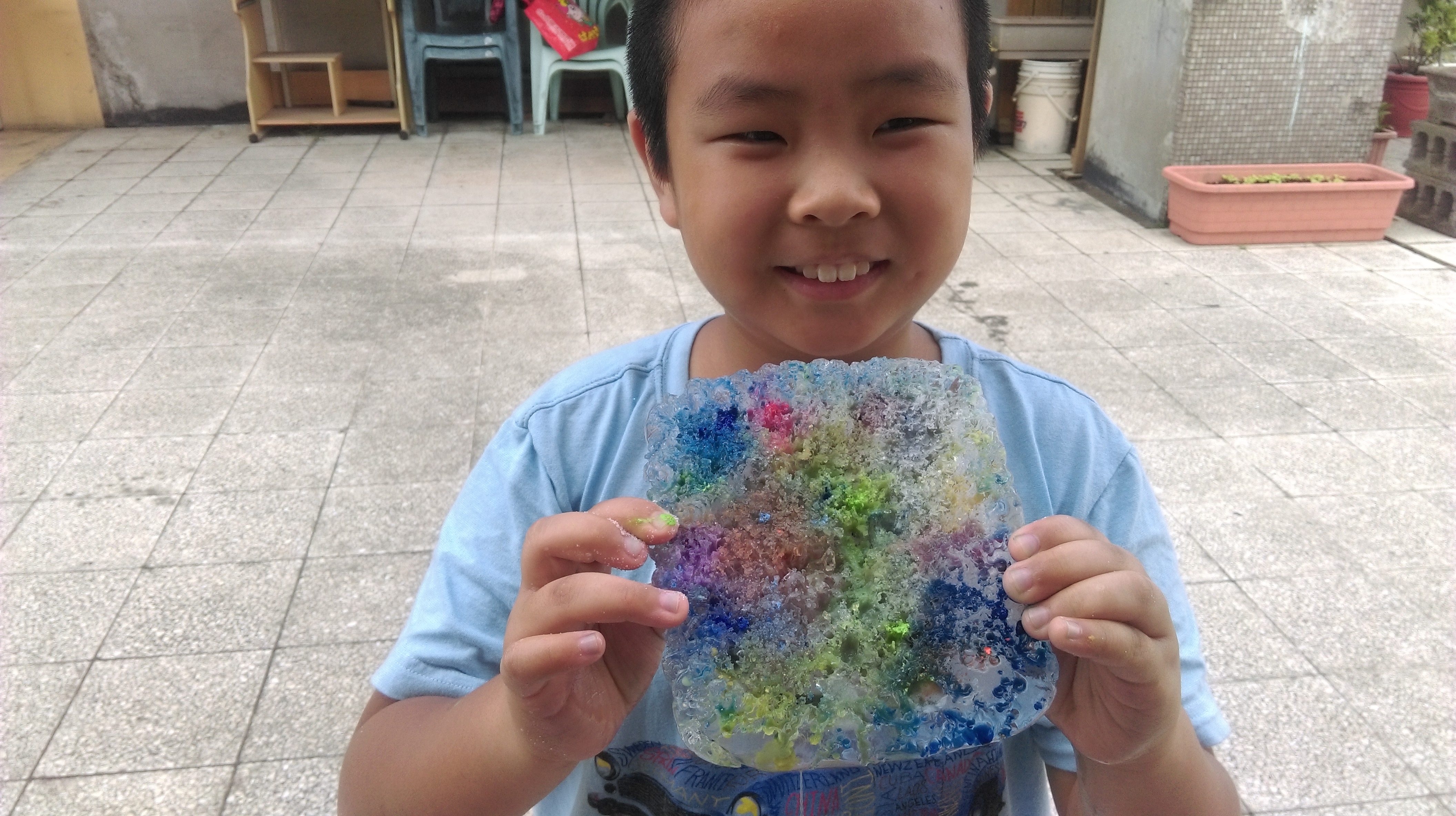 這也是另一個天氣熱我們必玩的water activity. 這次是用大一點的容器裝水然後等待結冰, 再將冰敲出來…讓孩子灑鹽在冰上, 並開始用水彩隨意在冰上畫畫! 因為鹽會融冰, 所以慢慢地小孩會看到冰開始有洞洞出現, 鹽開始在冰上鑽隧道囉!