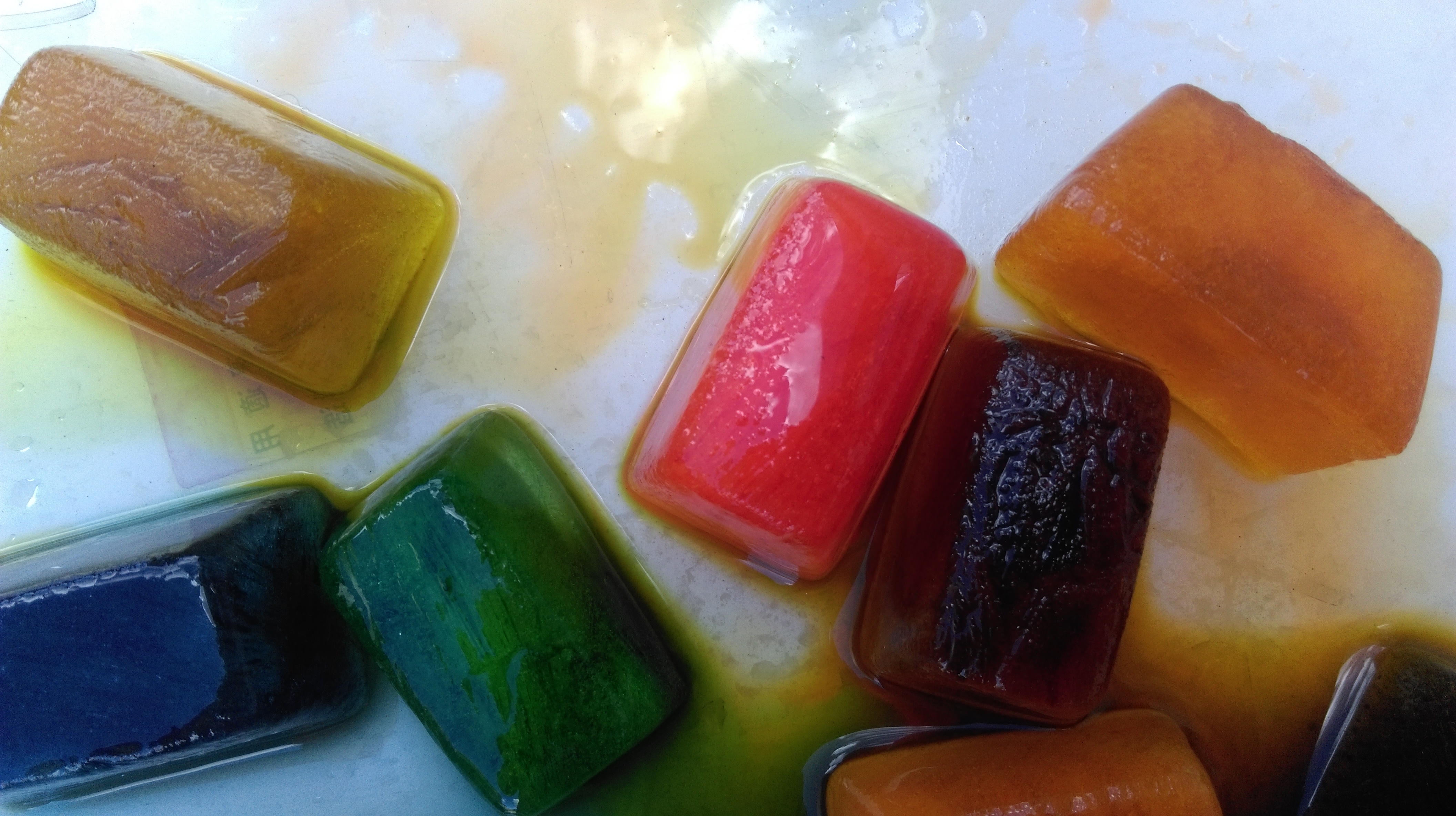 家裡有冰塊容器可以把不同的顏色加入每個冰磚格裡面, 用水彩或食用色素都可以! 待水結冰後, 五顏六色的冰磚就可以拿來畫畫囉!