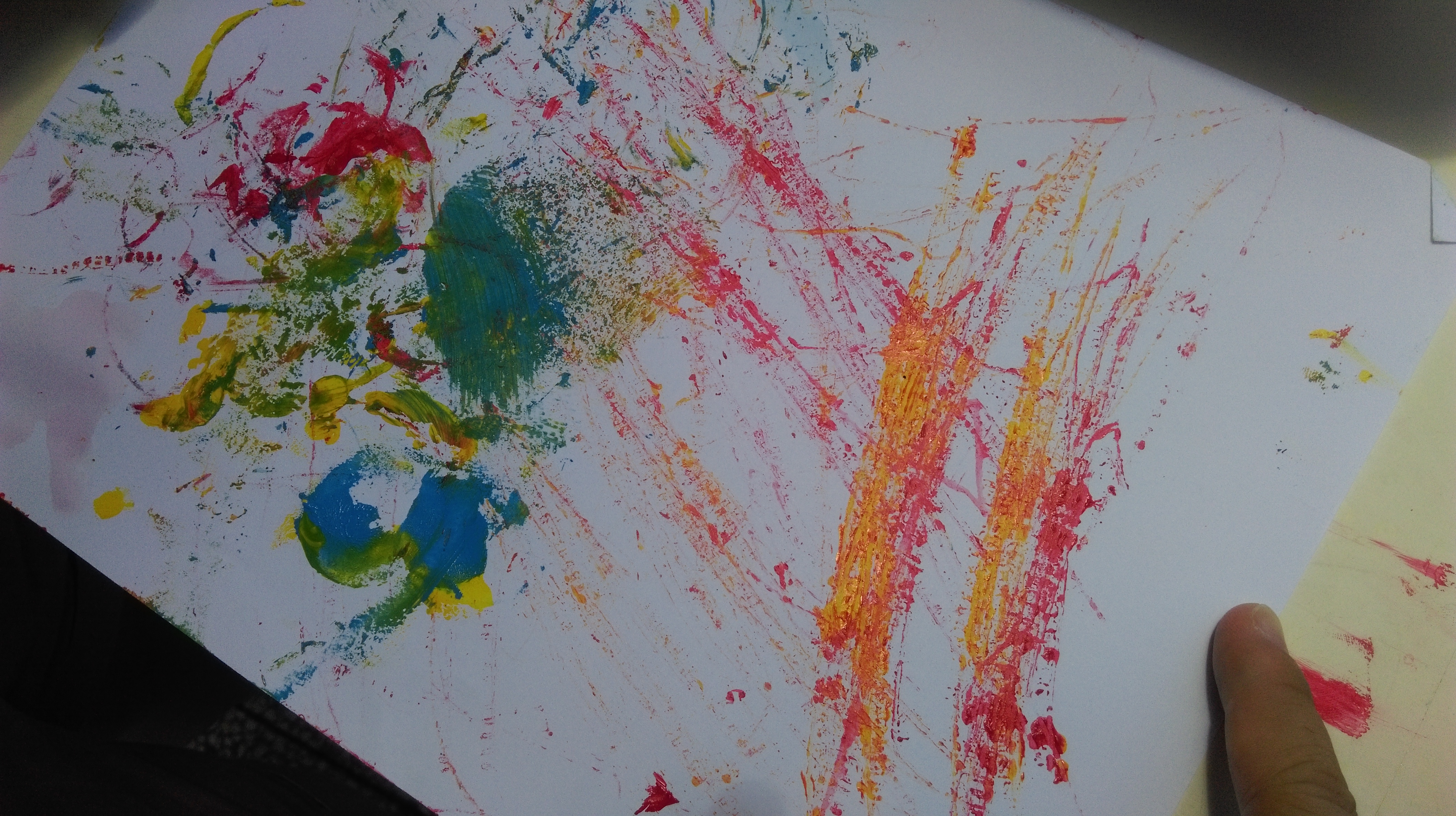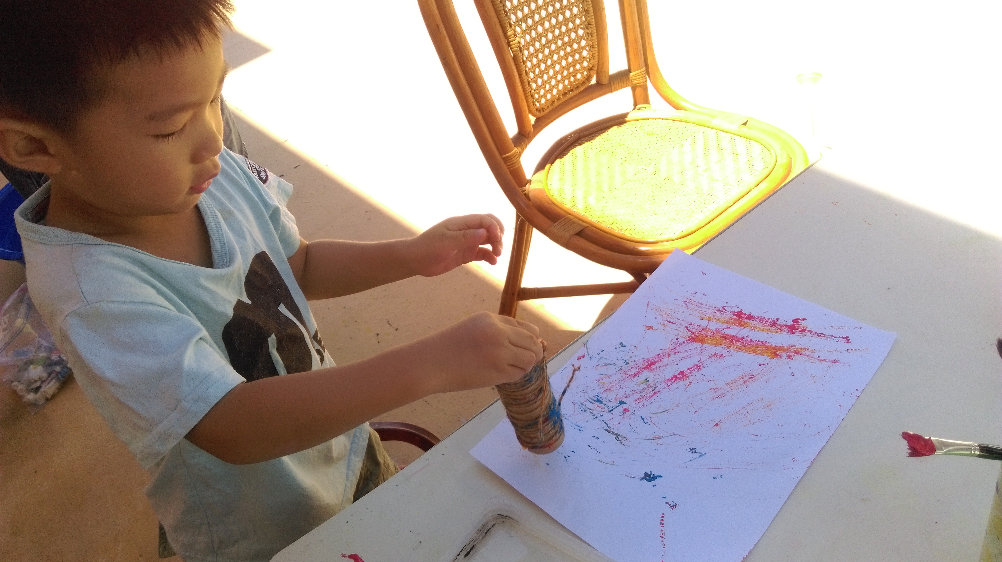 這是我們目前為止最喜歡的方式! 男生大都喜歡敲敲打打….而可以自由敲敲打打又可以在節奏中畫畫, 他們兩個都會打到忘我! 家裡有鼓棒或者長棍都可以拿來沾上顏色, 隨心所欲地將節奏打出來! 這兩個孩子打到隨著律動亂跳還加唱歌!