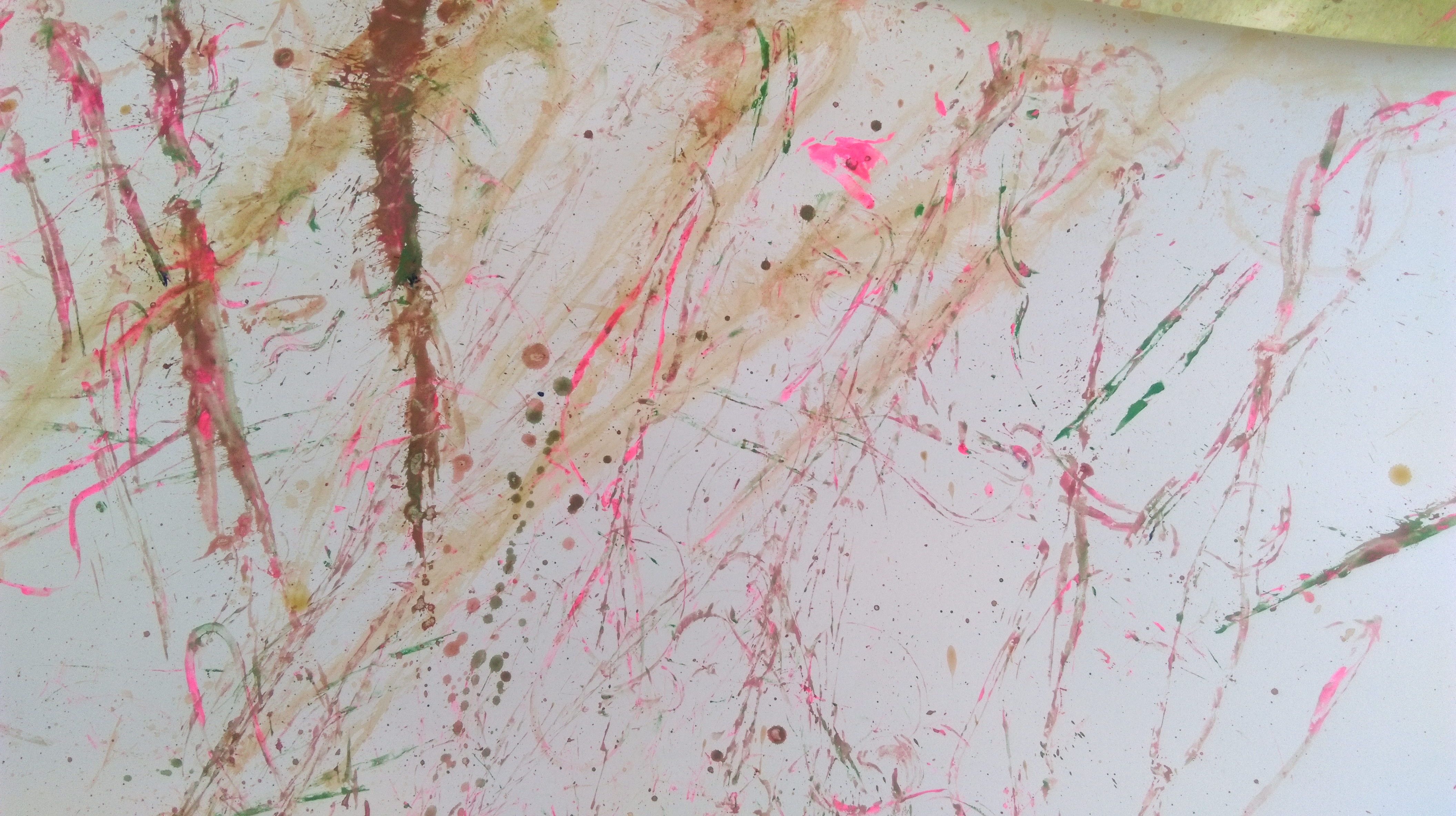 大家家裡應該多少都會有些橡皮筋吧? 把它們串起來, 就可以變成畫畫的工具囉! 把串好的橡皮筋沾滿顏料, 然後就可以在紙上像皮鞭一樣的甩跟打! 有時都還會一起出現橡皮筋圈的形狀喔! 看看我們鄰居甩橡皮筋~