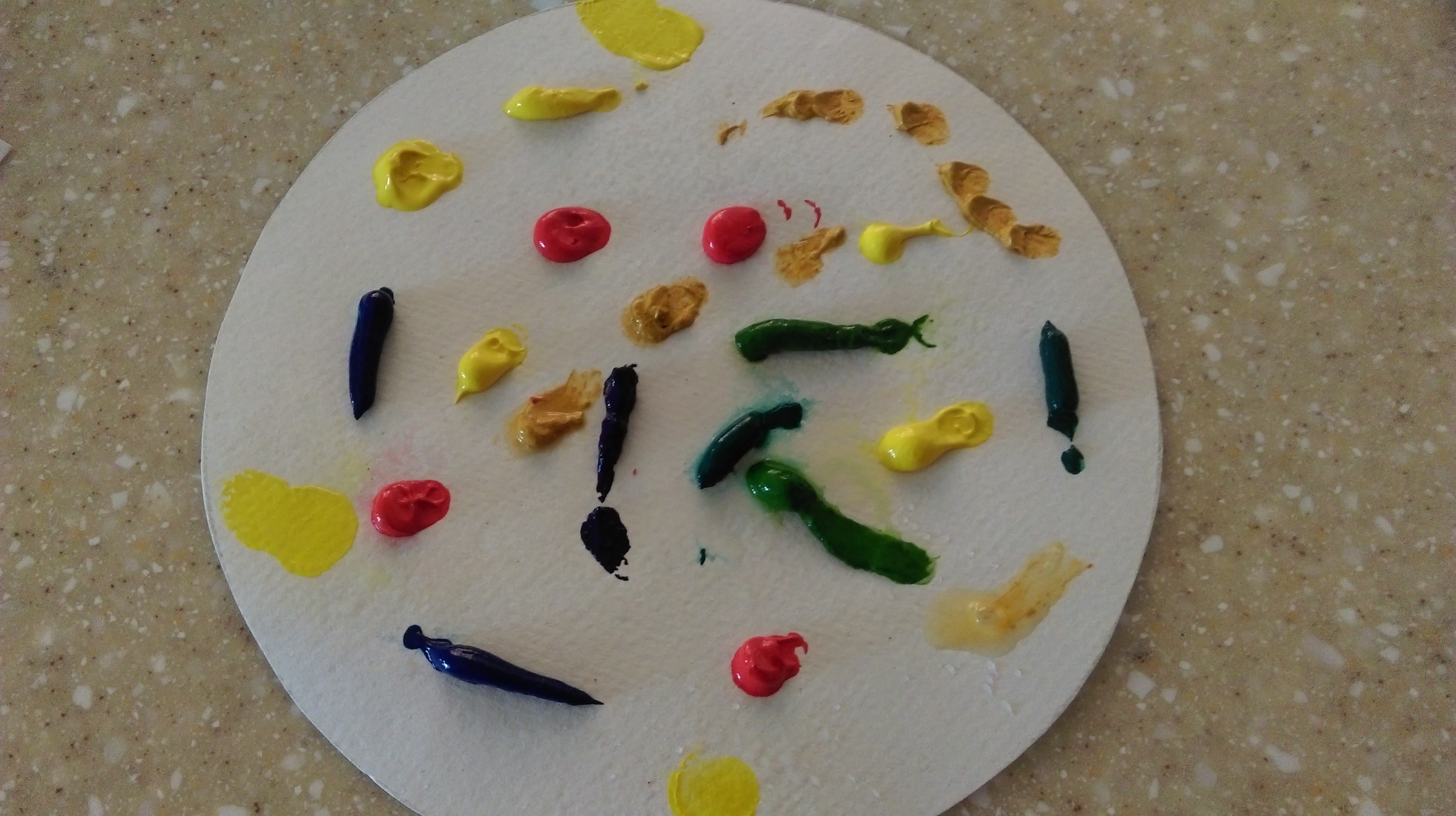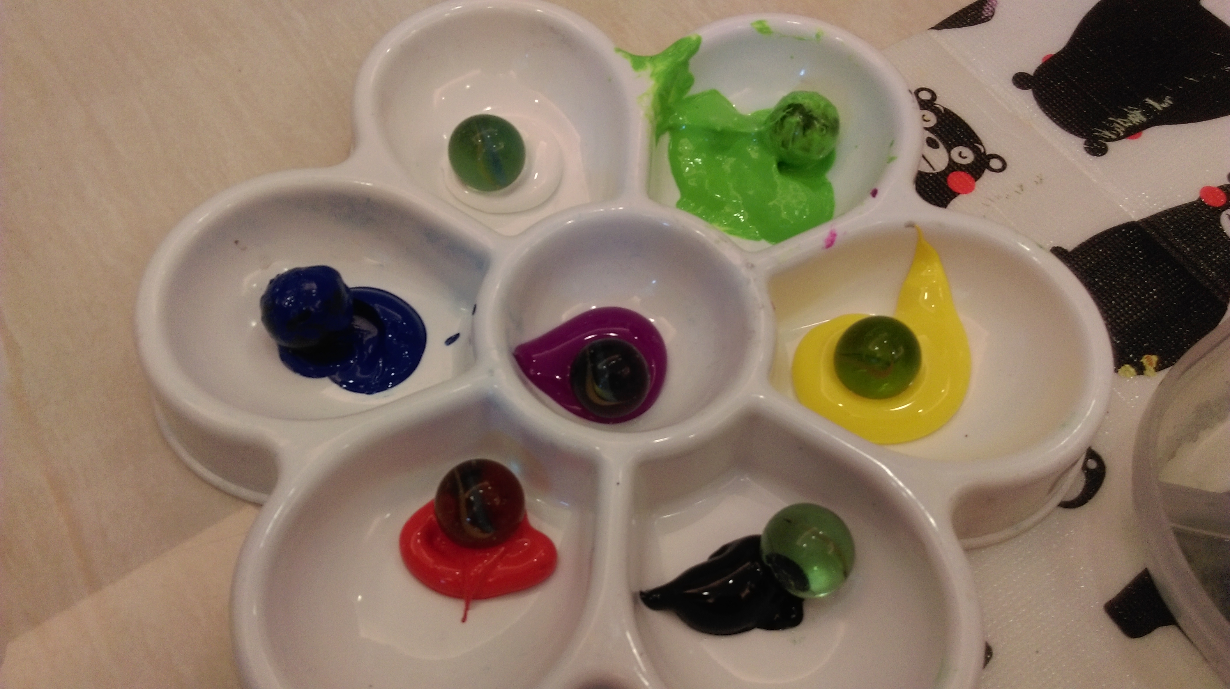 這個充滿刺激的畫畫方式讓我家兄弟倆玩的超開心! 我們用曲棍球的方式, 每個隊員都要有個叉子要把彈珠球射門得分! 首先把喜愛的顏色分別擠一點在調色盤上, 再把小彈珠分別放在不同的顏色裡沾滿, 就可以玩啦!