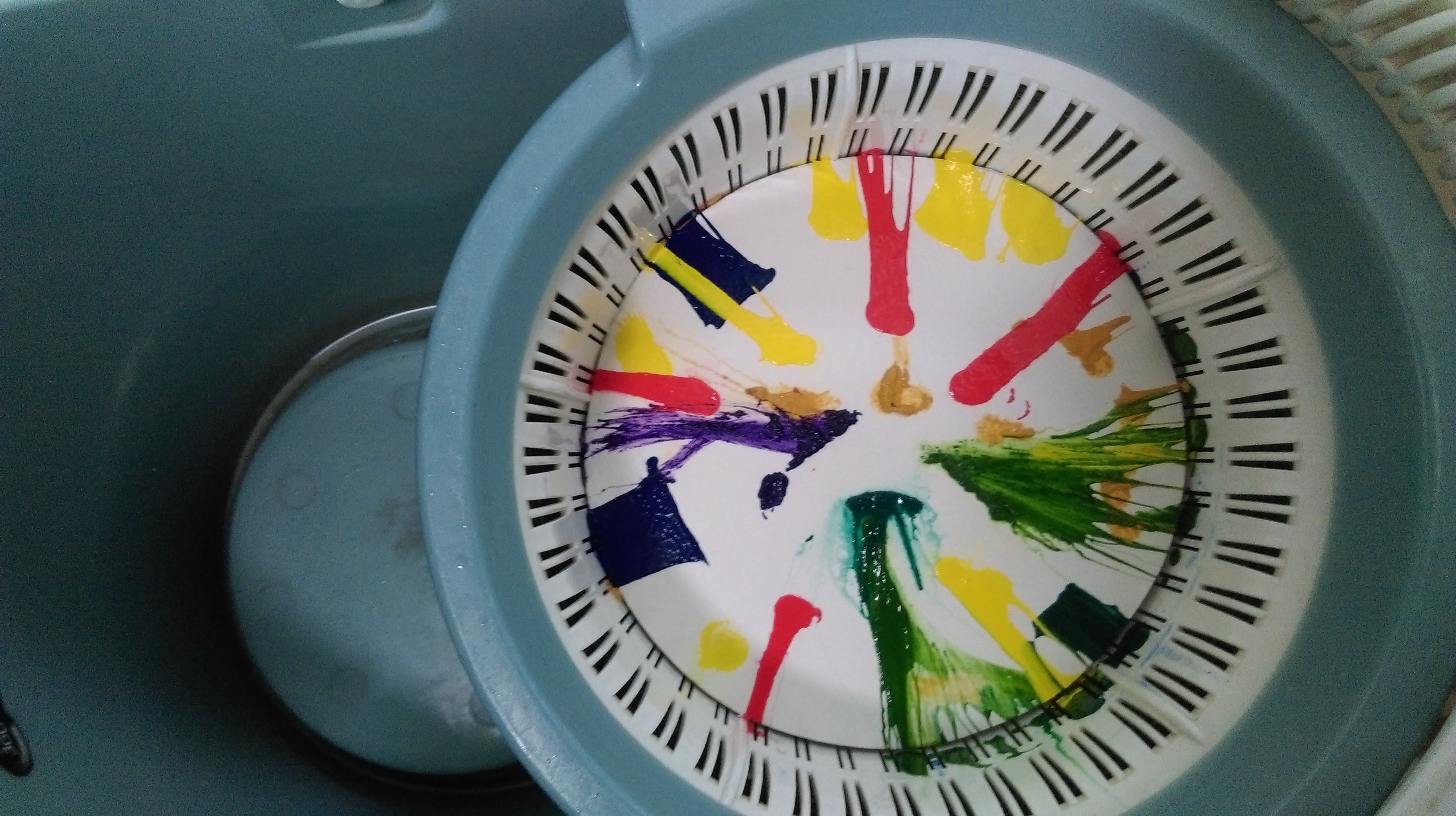 這個也是我們最愛的動作彩畫之一! 網路上已經很多人在用旋轉盤畫畫, 但旋轉盤製作我嫌麻煩, 我也懶得做一個…更別說家裡沒有空間放了. 一天在拖地的時候看到每天再用的好神拖, 它旋轉的原理不也是一樣嗎? 結果…..我大半夜的爬起來自己開始玩起來了. 咦?! 好像可以喔…隔天小孩們自己試試看, 因為好神拖是圓形的關係, 要剪圓形狀才好用..剪好後把喜歡的顏色隨意的擠幾粒花生大的在紙上,