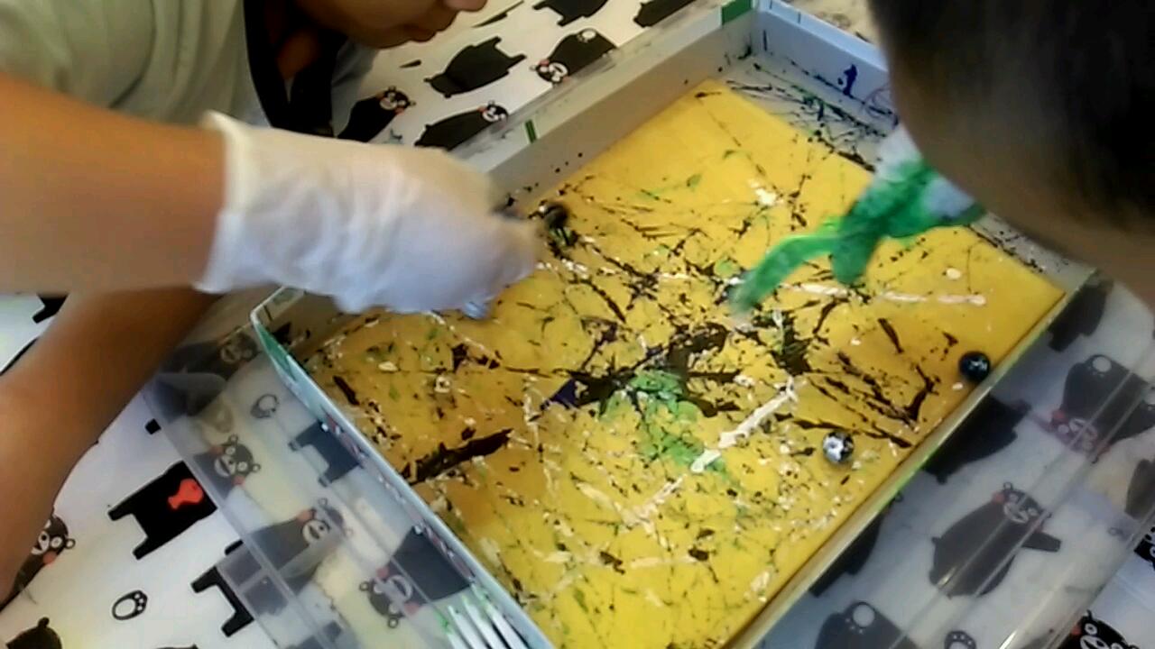 我吹, 我吹, 我用力吹吹吹!! 泡泡要吹到比鍋子高(越高越好), 然後滴幾滴食用色素或水彩在泡泡上面, 再把紙輕輕壓在有顏色的泡泡上面…幾秒鐘後拿起來就有印在上面囉! 這個影片把步驟做得很清楚..