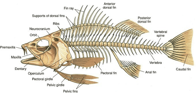 在下定論之前, 我們先來看看人類的骨骼系統並把人類跟魚類的骨骼左右並排來做個比較。