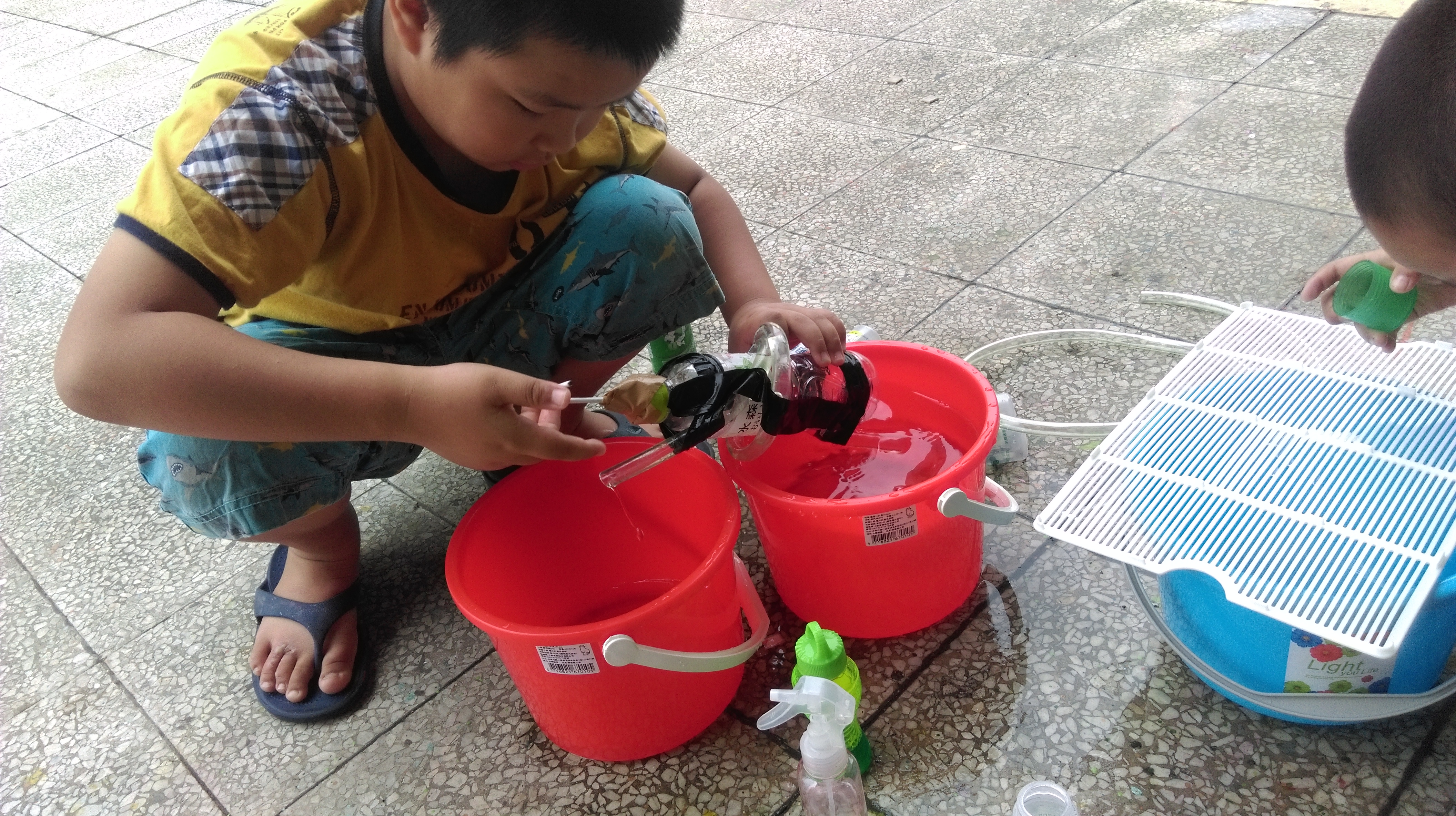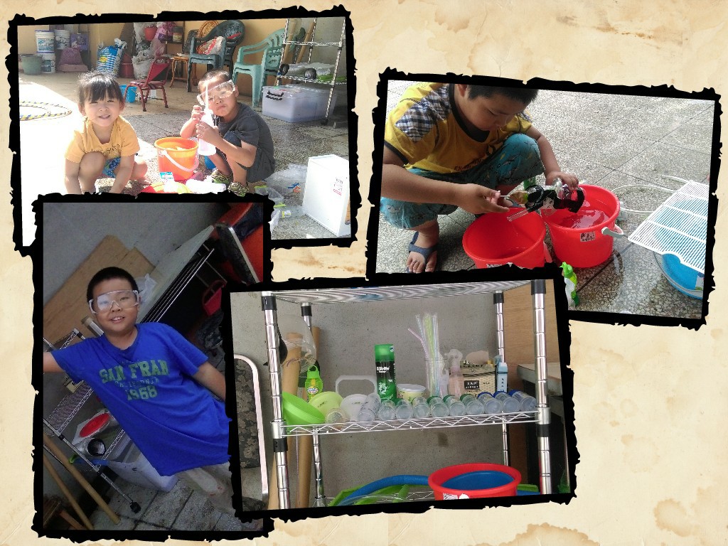 最上層就是量杯,量匙,  回收瓶等等……..這些哩哩摳摳的東西就足以夠他們兩個玩很久了……每週三早上是我們固定上科學的時間, 但除了上課的時間之外, 他們也喜歡在自由活動的時候自己東加西加隨意實驗, 或把水管裝起來玩彈珠…..這樣隨興的實驗雖然不見得有甚麼大發明, 但是無形中孩子的觀察, 思考, 跟表達能力也漸漸地發展起來…最重要的是, 任何東西不管是回收物品, 柴米油鹽, 都可以變成有趣的學習, 增進學習的胃口以及探索的熱誠! 這在現今台灣填鴨的教育中是難能可貴的, 而且這樣的投資不用花很多錢(都是回收物品較多), 比玩具好太多啦!!