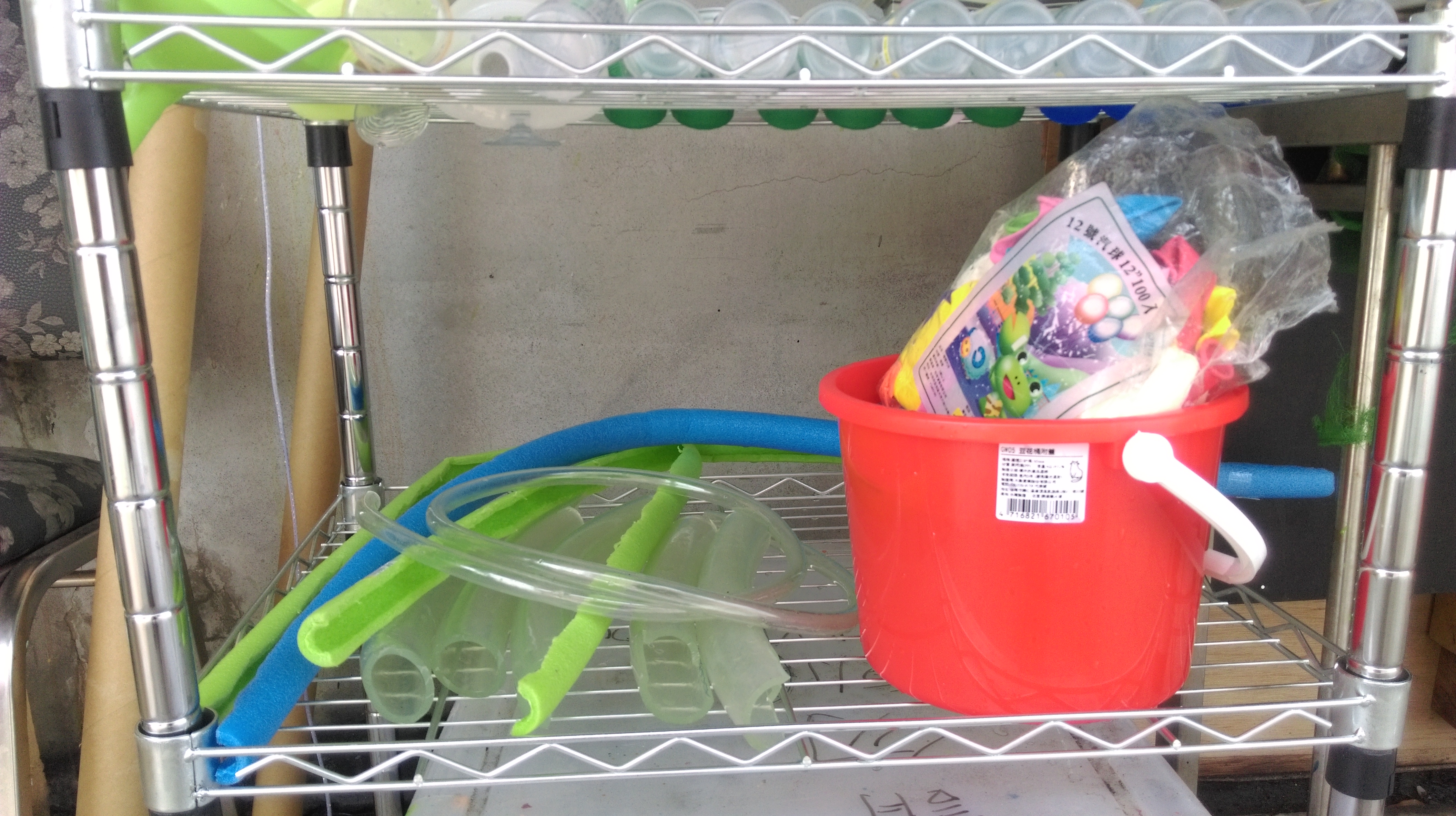 我們在家樂福買了這個三層架, 把一些孩子平常喜歡玩的工具擺上架子, 裡面有水桶, 回收牛奶瓶, 空漿糊盒 (我們收集了10個左右…會有這麼多是因為把漿糊拿來做史萊姆了..Slime.) 插播: 想要做史萊姆可以看這個影片唷..