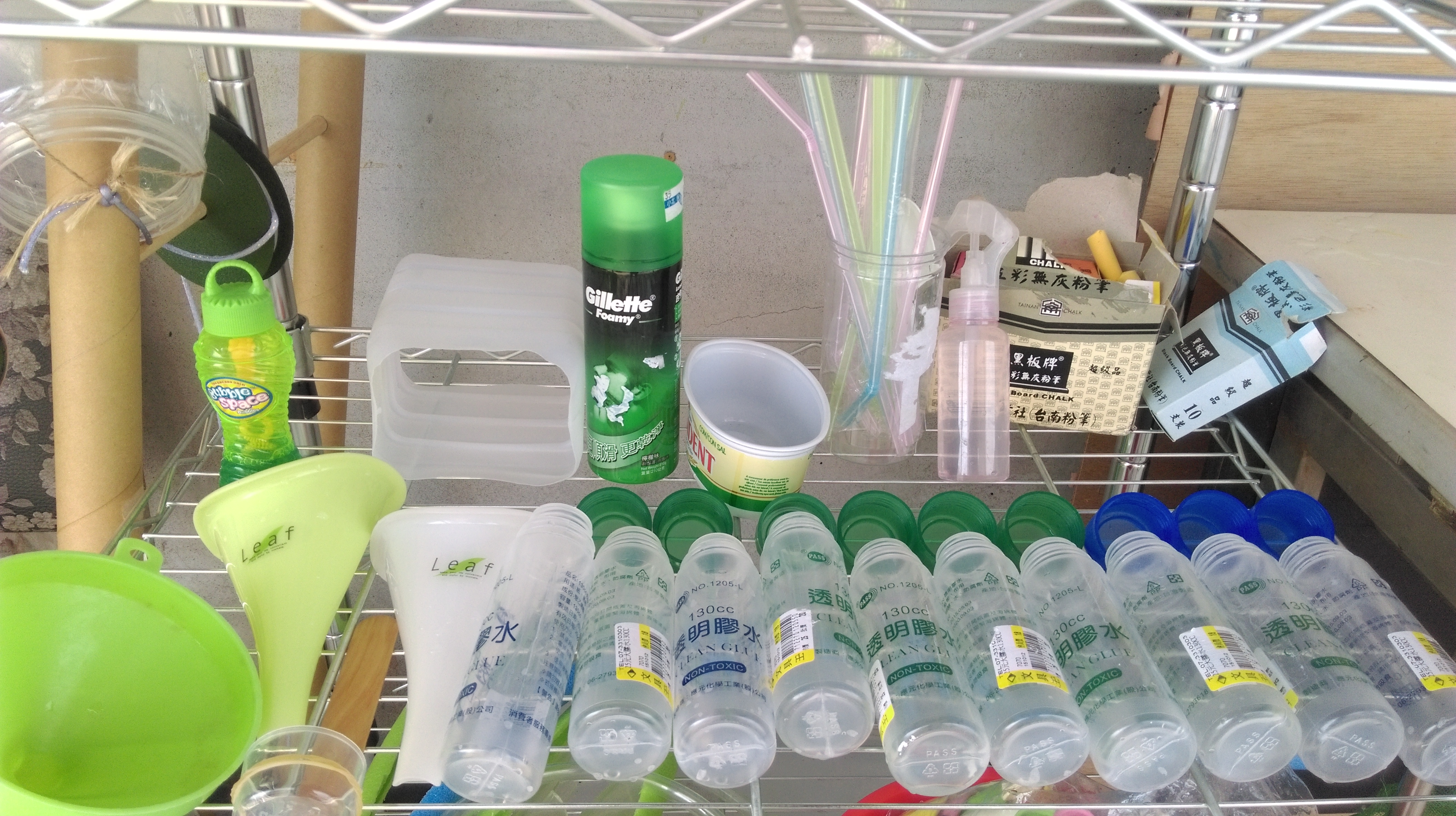第二層的東西就多啦! 有一堆空的膠水盒, 三個漏斗, 吸管, 湯匙, 一盒粉筆, 噴霧器, 泡泡跟刮鬍霜。粉筆是他們拿來在地上塗鴉還有我戶外上課的時候用的, 刮鬍霜可以拿來玩彩畫。可以點我這篇文章看看刮鬍霜怎麼彩畫唷! IMAG3284