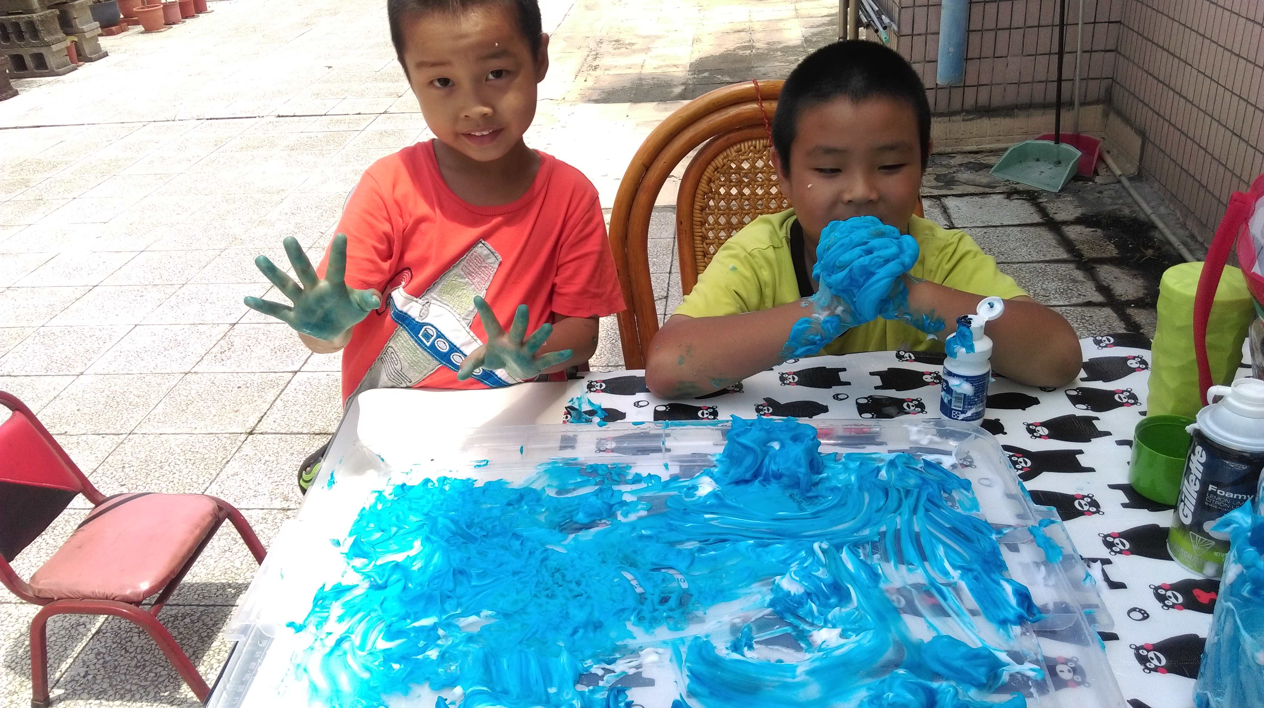 我們第一個活動就是徒手畫雲….我用大收納箱的蓋子作畫板, 讓小朋友用刮鬍雙先噴一大坨之後, 在滴幾滴藍色的食用色素…小朋友就可以隨意用手捏造想像中的雲囉! 在戶外玩這個真是不錯, 不怕地板弄髒可以很隨興自由的玩! 你看看…我們的手!