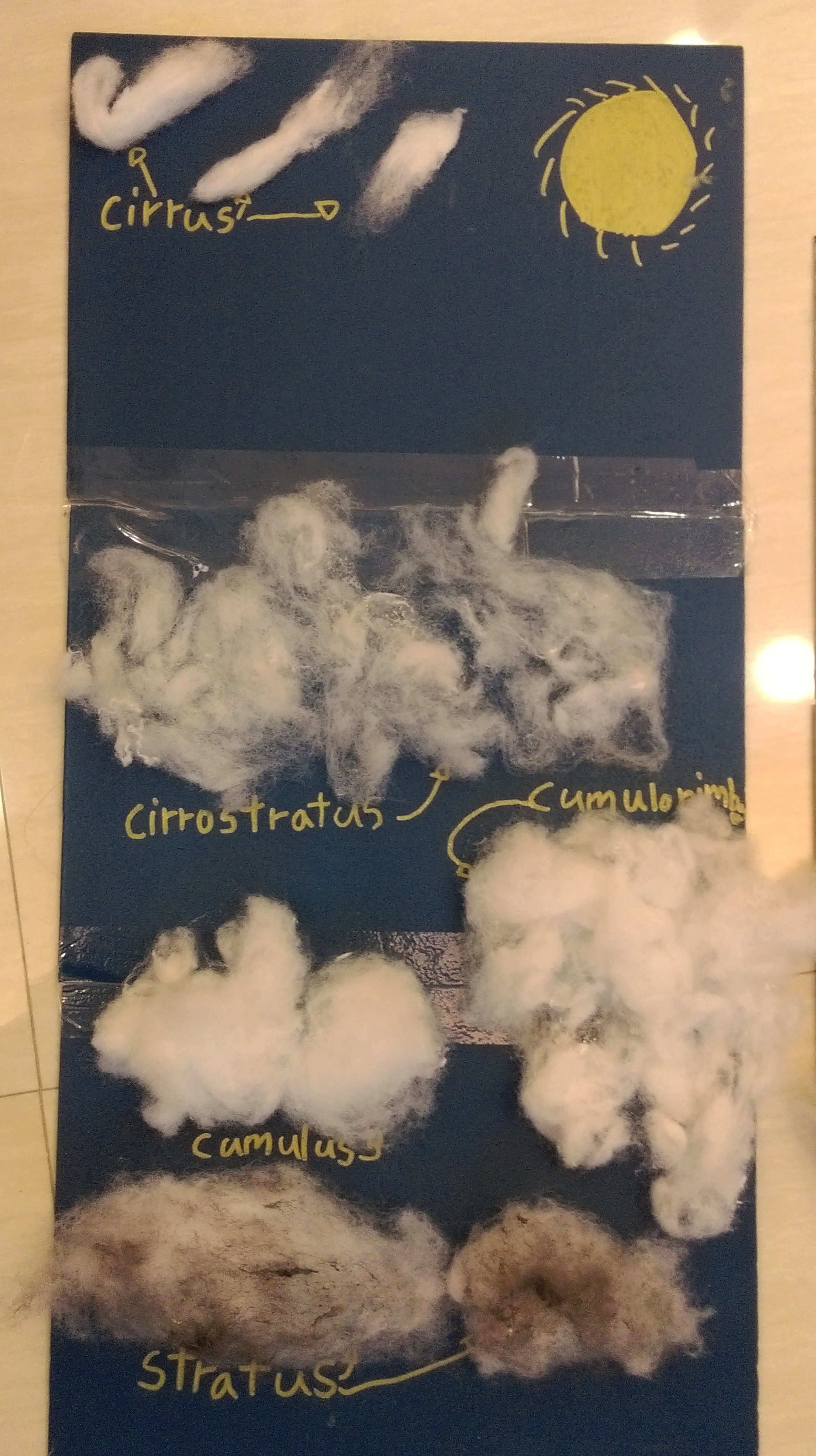 我們做這個立體書的材料也很簡單, 棉花…珍珠板, 白膠…就這樣! 小朋友可以將雲種類捏成形後抹上白膠固定住即可! 晚上版的天空還可以在加上一點金粉就很美麗囉!