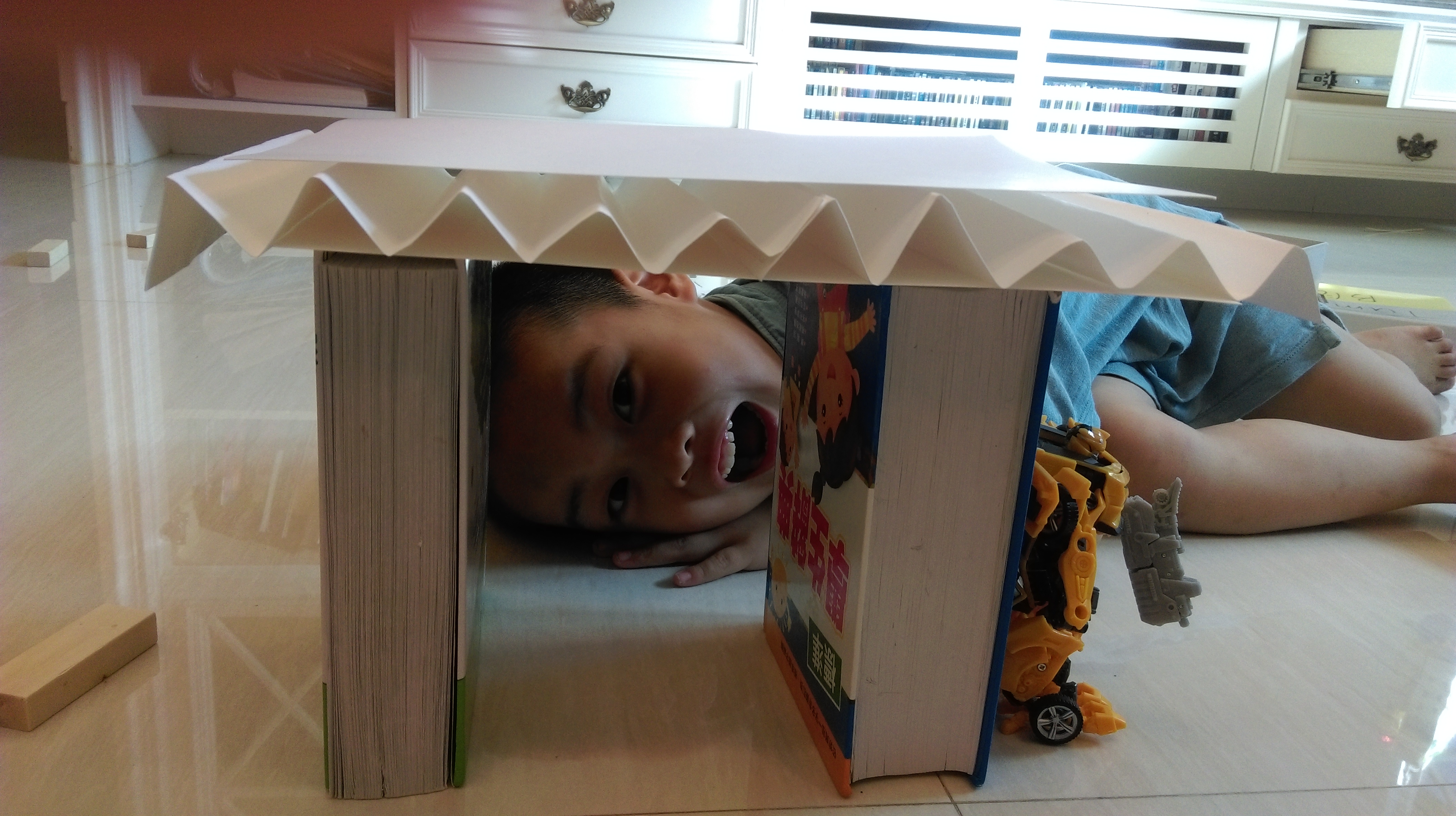 橋最基本的類型就是Beam bridge 梁橋, 它的構造基本上就是一個甲板跟兩根橋梁, 是橋類型裡面最簡單的一種。我們用兩本厚書立著在兩邊, 再放一張紙做甲板(紙可以是厚一點的)。讓小朋友預測它可以乘載多少個積木呢? 幼兒園小朋友的預測數字可以在一張紙上畫圈圈來代表。大一點的朋友就可以自行寫下他的預測。